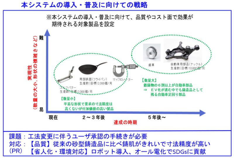 環境対応型新鋳鉄鋳造機械システムによる工法変更に伴う、ユーザ承認の手続きが必要とはなるが、従来の砂型鋳造に比べ、金型鋳造は、鋳肌がきれいで寸法精度が高いこと、ロボットを導入してオール電化にすれば、SDGsにも貢献できることをPRして、新鋳鉄鋳造機械システムの普及を図る。