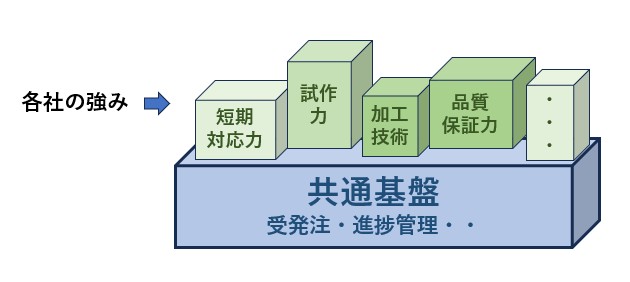 方向性が定まった後の第一歩は、受発注や進捗管理といった共通業務を整理し、「共通基盤」として構築することです。業務フローそのものは企業ごとに異なるため完全な統一は困難ですが、共通データが整えば取引や連携は大幅に効率化できます。その上で、各社の強み(短納期対応力、試作力、品質保証力など)やサービスを重ね合わせることで、連携の効果を最大化できます。実際に、燕市の SFTC や大田区の「プラッとものづくり」は、共通基盤を起点に各社の強みを発揮できる仕組みを整えています。(図2参照)