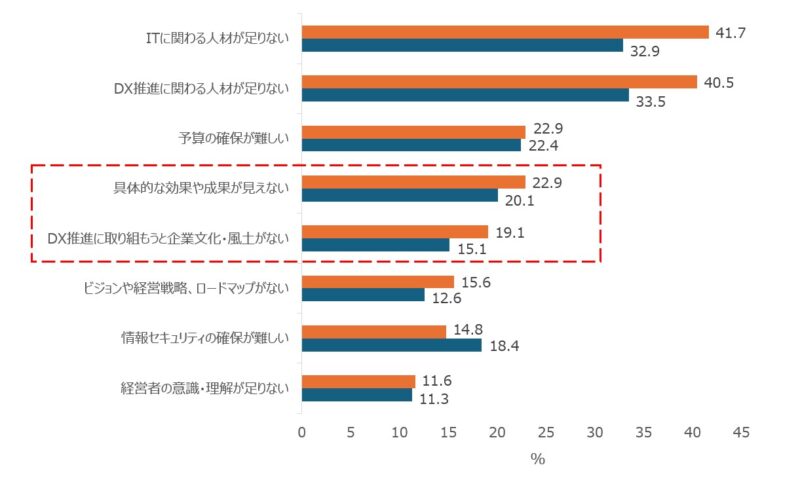 中小機構の「中小企業のDX推進に関する調査(2024年)」によると、“人材不足”“予算の確保の難しさ”に次いで多かった課題が、「具体的な効果が見えない」「DXに前向きな企業文化がない」という“意識や風土”の壁でした。