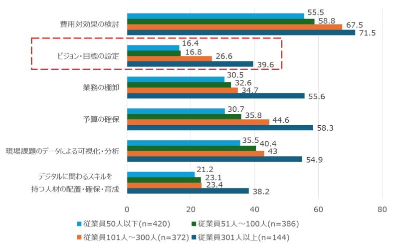 ところが、実際に「ビジョンや目標を設定して取り組んでいる」中小企業は多くありません。『ものづくり白書2025』によると、従業員数50名以下の企業で「デジタル技術導入・活用にあたって実施したこと」として最も多かったのは「費用対効果の検討」(56%)。一方、「ビジョン・目標の設定」を挙げた企業はわずか16%にとどまりました。大企業では約40%に達しており、この差が“戦略の有無”として成果を分けている可能性があります。