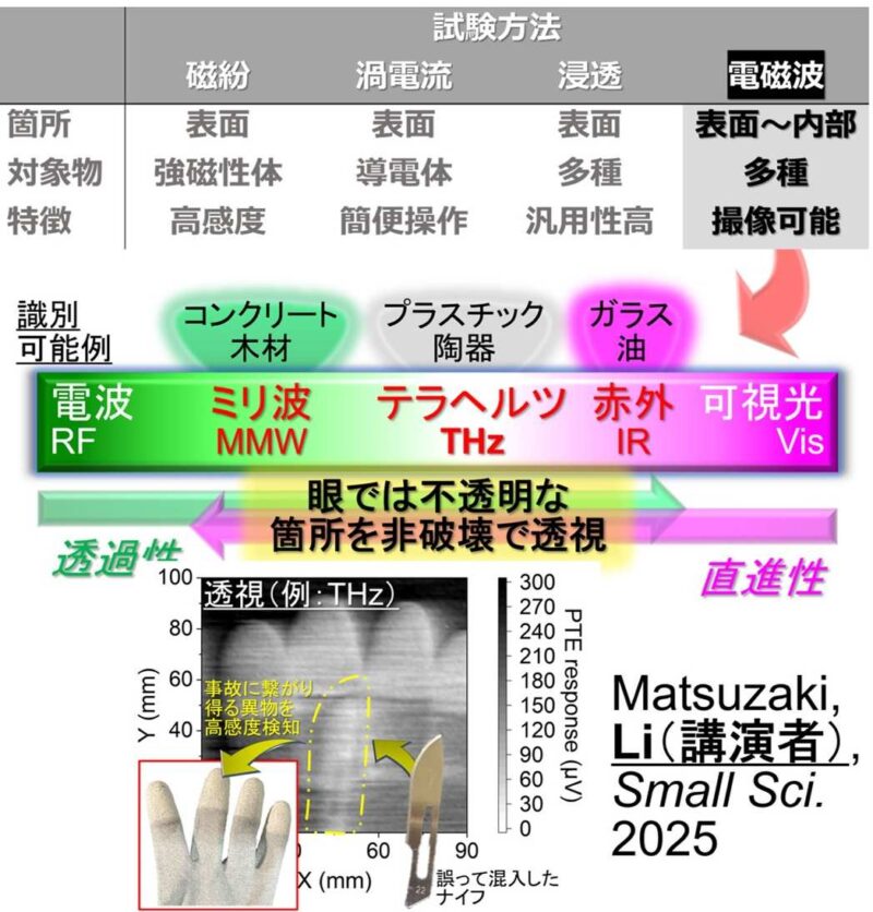 特に需要が高まっている分野としては,医薬品検査への期待が寄せられている.従来の検査技術において主役となるX線計測に対して,非金属材料間での高信頼な材質同定から相補的役割を担う.Li(講演者),Commun.Mater.2025