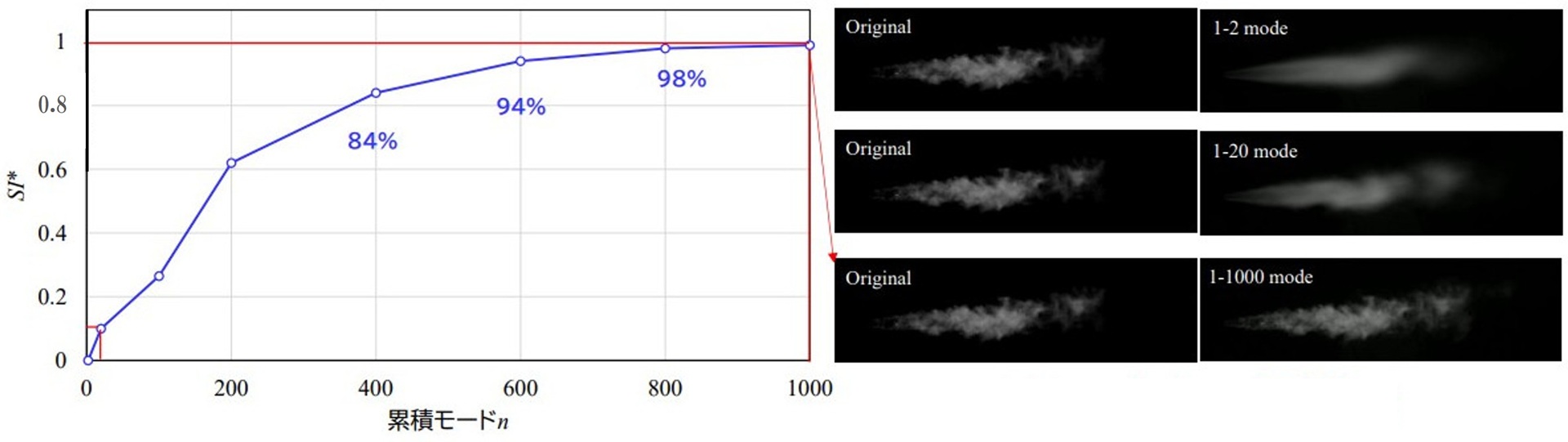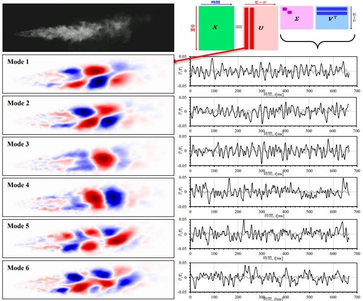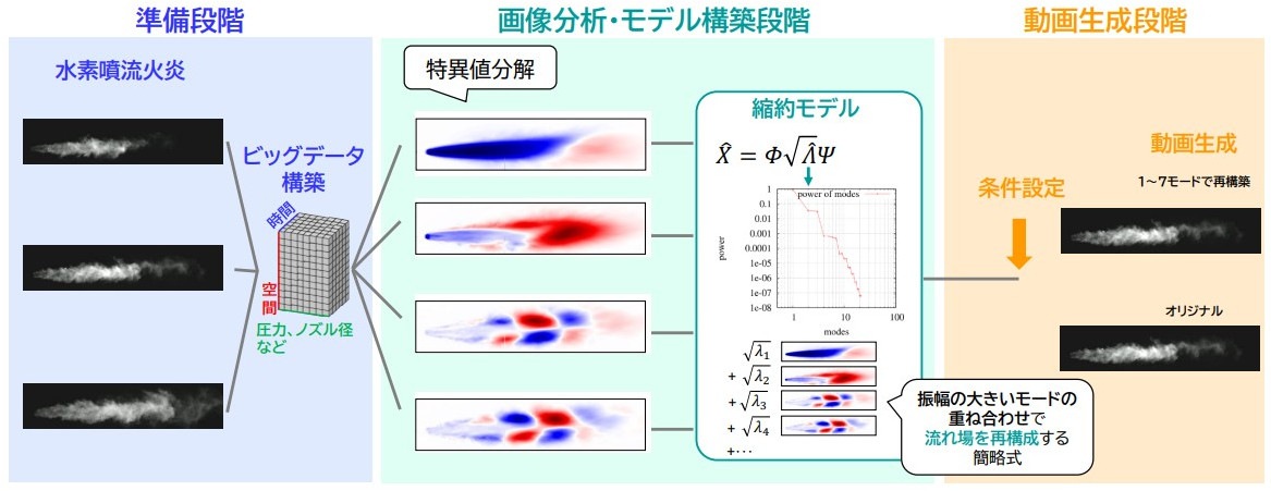 SVDで空間モードと時間係数を算出し、さらに縮約モデルを構築した。このモデルに噴出条件を与えることで、仮想空間に噴流火炎を準リアルタイムで再構成する枠組みを提示した。