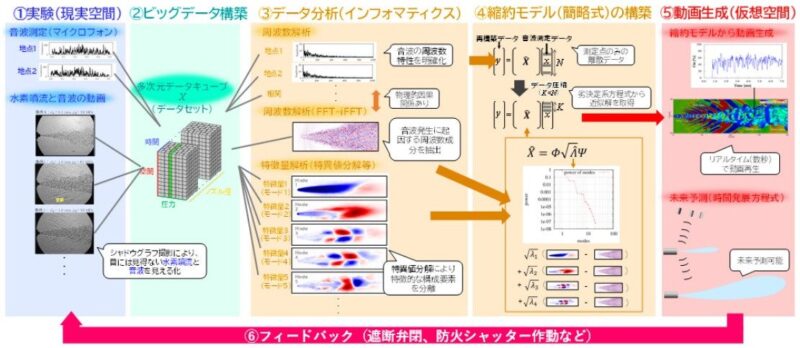 – マイクで取得した高時間分解能データを仮想空間でリアルタイム再現し、スプリンクラー・強制換気・防壁の作動タイミング/箇所を自動決定することで被害を最小化する自律防災へ発展し、設備のCADデータ連携により複雑形状の現場にも迅速に適用できるようになる。