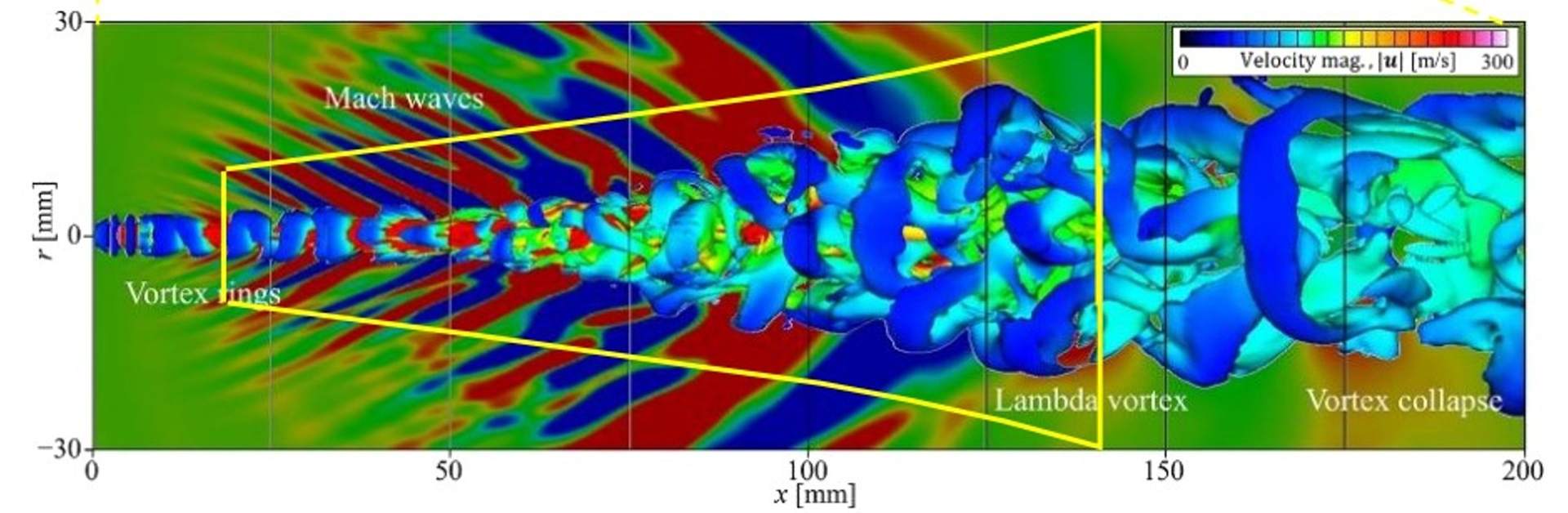 本研究では、噴出圧力やノズル径を系統的に変えた水素噴流のシャドウグラフ動画と多点音圧計測から大規模データを整備し、①保有特許のFFT-iFFT法により音波生成に寄与する剪断渦成分を抽出、②SVDで空間モードと時間係数を同定して縮約モデルを構築した。さらに、マイクロフォンアレイの指向性解析と到来時間差解析により噴射位置・方向を推定し、現場音を入力として仮想空間内に噴流場を準リアルタイムで再構成した。