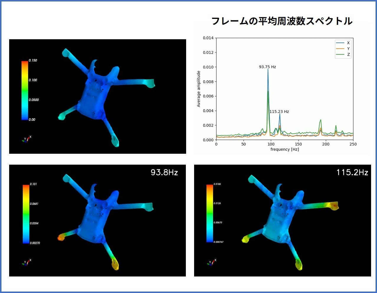 特にPosture 2(118Hz)やPosture 1(98Hz)のような高周波域での共振モードの変化は、姿勢変化による構造剛性の変化を反映しており、従来の単点計測では見逃されていた現象である。
