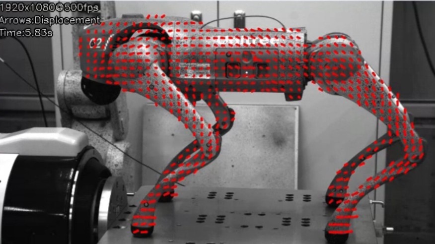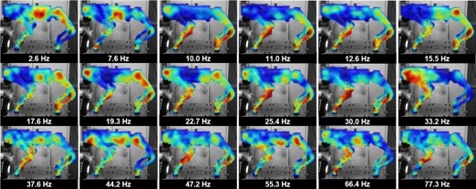 Unitree Go2(重量15kg)を対象に、全身458-513点を高密度にトラッキングし、垂直・水平方向の加振に対する動特性を解析。